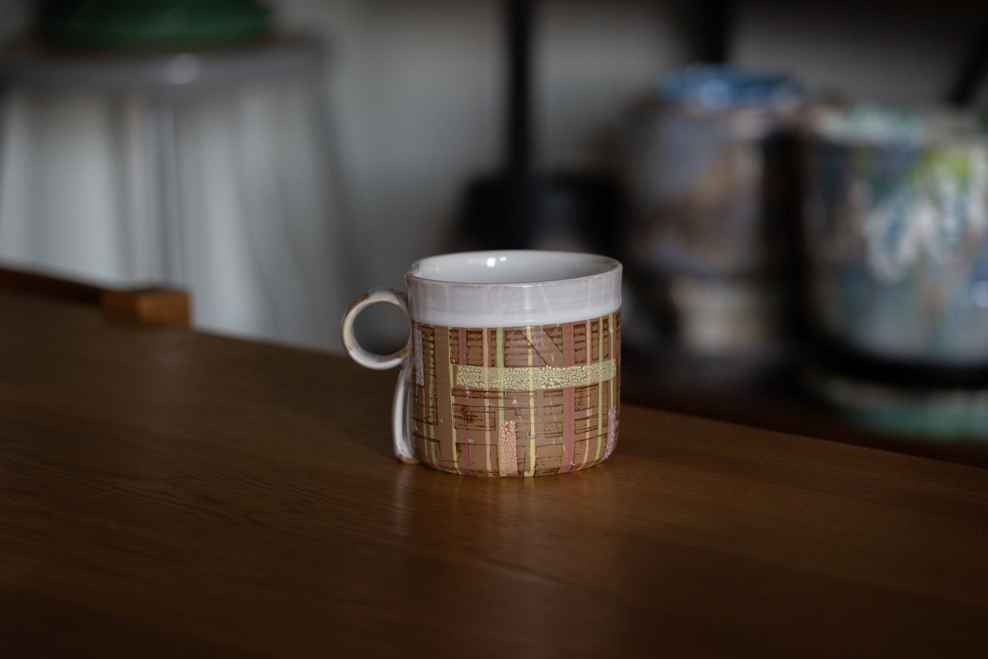 One-of-a-kind hand painted porcelain mug with textured glaze and sculptural handle. Tactile. Intentional. Functional art. Height: approx. 8.89 cm / 3.5" Width: approx. 10.16 cm / 4" (13.97 cm / 5.5" including handle)