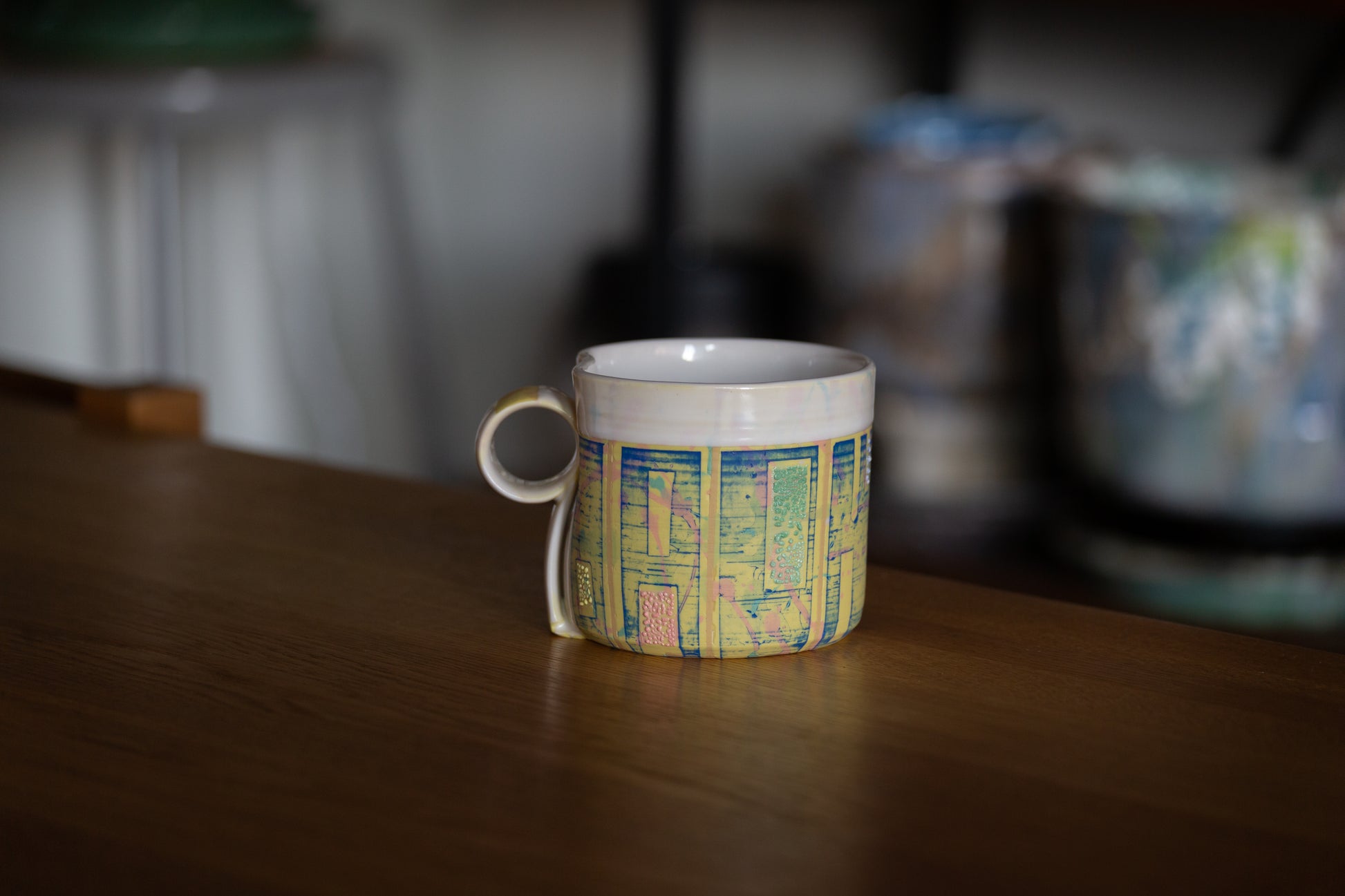 One-of-a-kind hand painted porcelain mug with textured glaze and sculptural handle. Tactile. Intentional. Functional art. Height: approx. 8.89 cm / 3.5" Width: approx. 10.16 cm / 4" (13.97 cm / 5.5" including handle)
