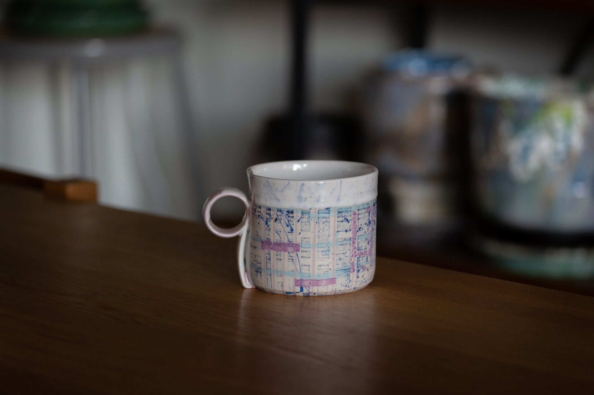 One-of-a-kind hand painted porcelain mug with textured glaze and sculptural handle. Tactile. Intentional. Functional art. Height: approx. 8.89 cm / 3.5" Width: approx. 10.16 cm / 4" (13.97 cm / 5.5" including handle)