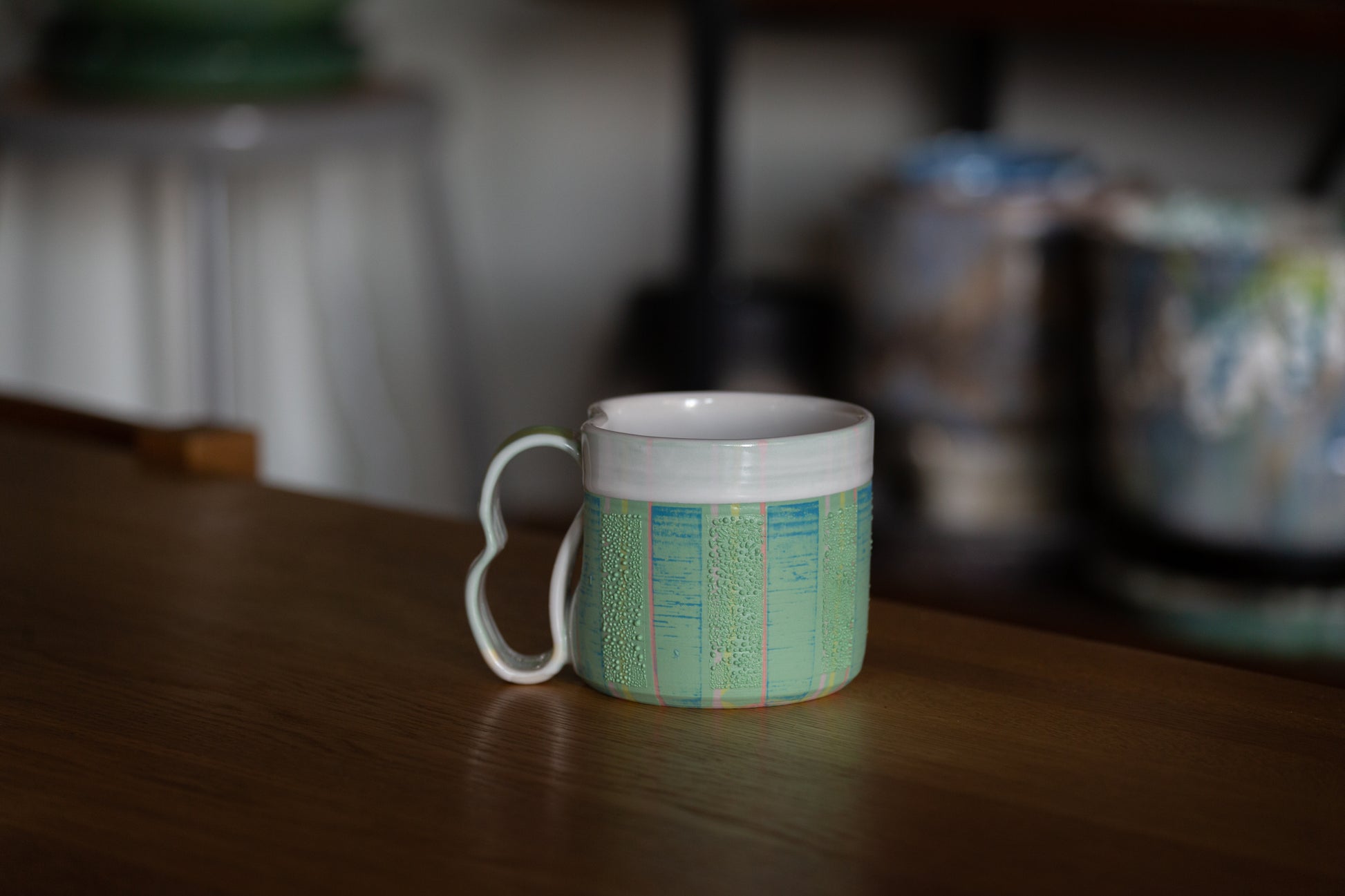 One-of-a-kind hand painted porcelain mug with textured glaze and sculptural handle. Tactile. Intentional. Functional art. Height: approx. 8.89 cm / 3.5" Width: approx. 10.16 cm / 4" (13.97 cm / 5.5" including handle)