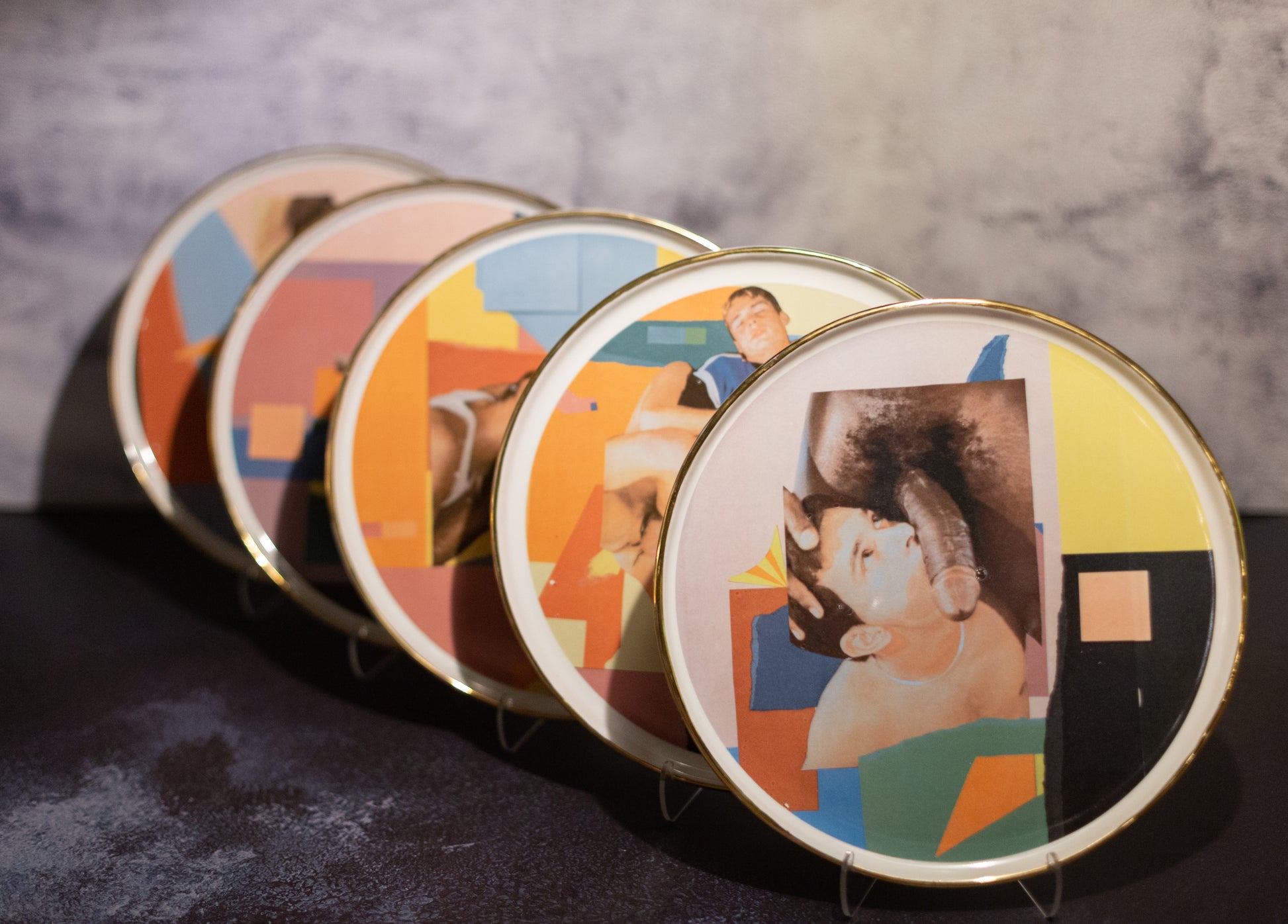Limited edition of 5. Each food safe porcelain plate is hand-numbered, collaged with vintage gay erotica and finished with a 24k gold rim. Diameter: approx. 27.94 cm / 11" Care Instructions: Not microwave or dishwasher safe due to gold detailing. Hand wash with care. Designed for functional use or display.